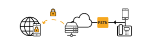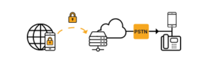 From a SecuSUITE -enabled mobile device to the user’s home network and from there to external mobile or landlines via PSTN extension.