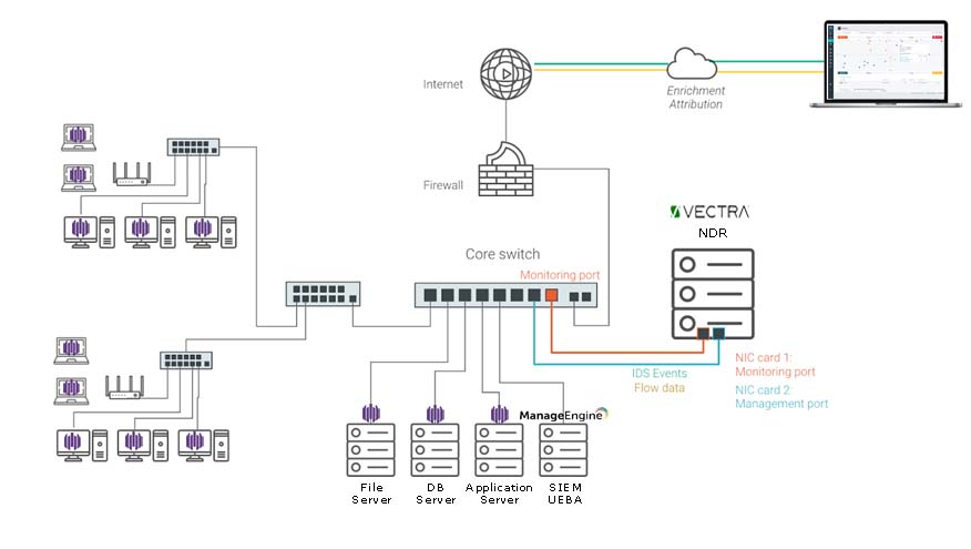 The Vectra NDR platform collects, detects and prioritizes high-fidelity alerts in real time and responds with automated enforcement or alerts to security personnel. Security teams use this information for threat hunting and retrospective investigations via a subscription service. To build customized security analytics, Vectra enriches and streams the data to SIEMs and data lakes.